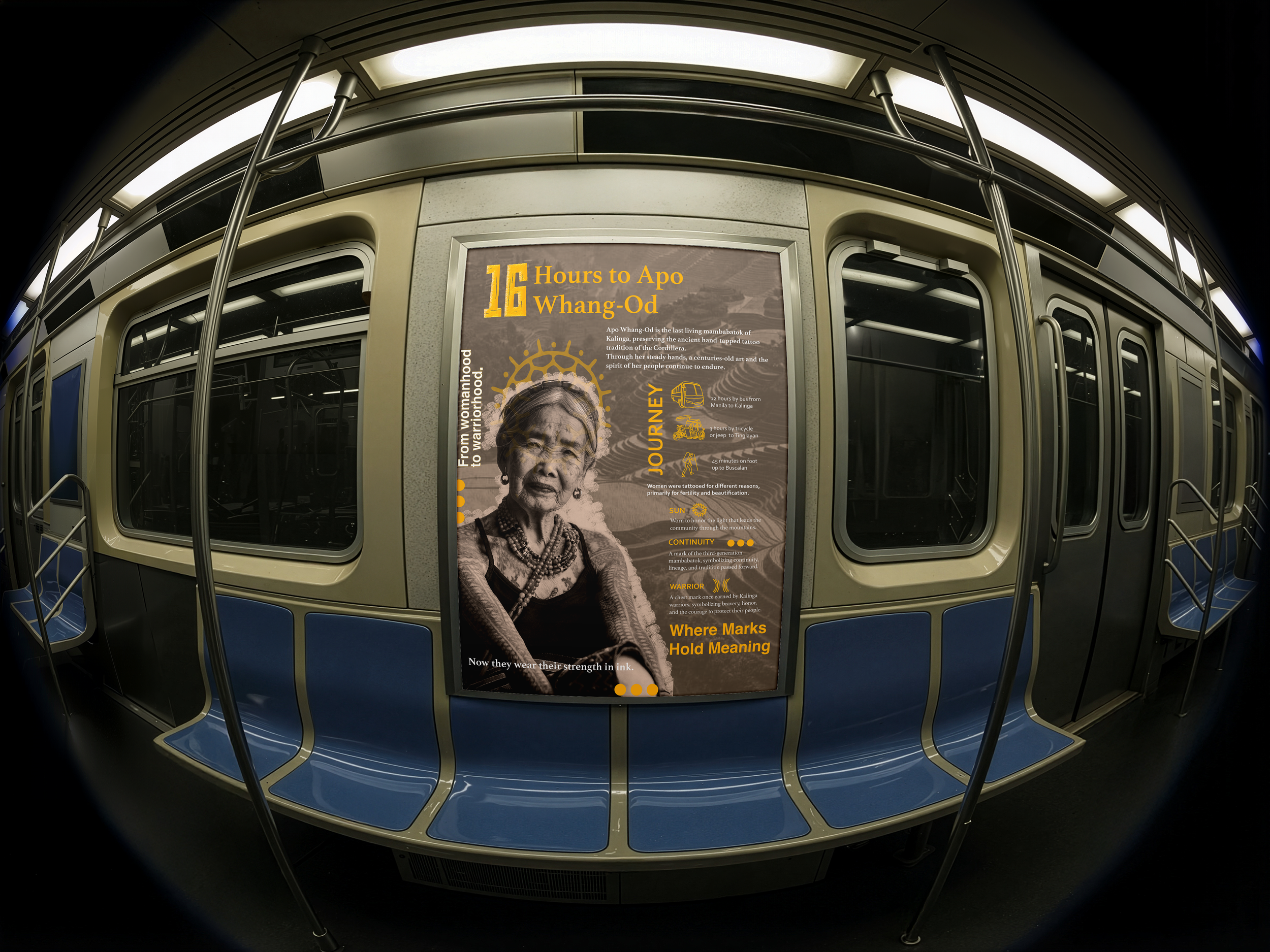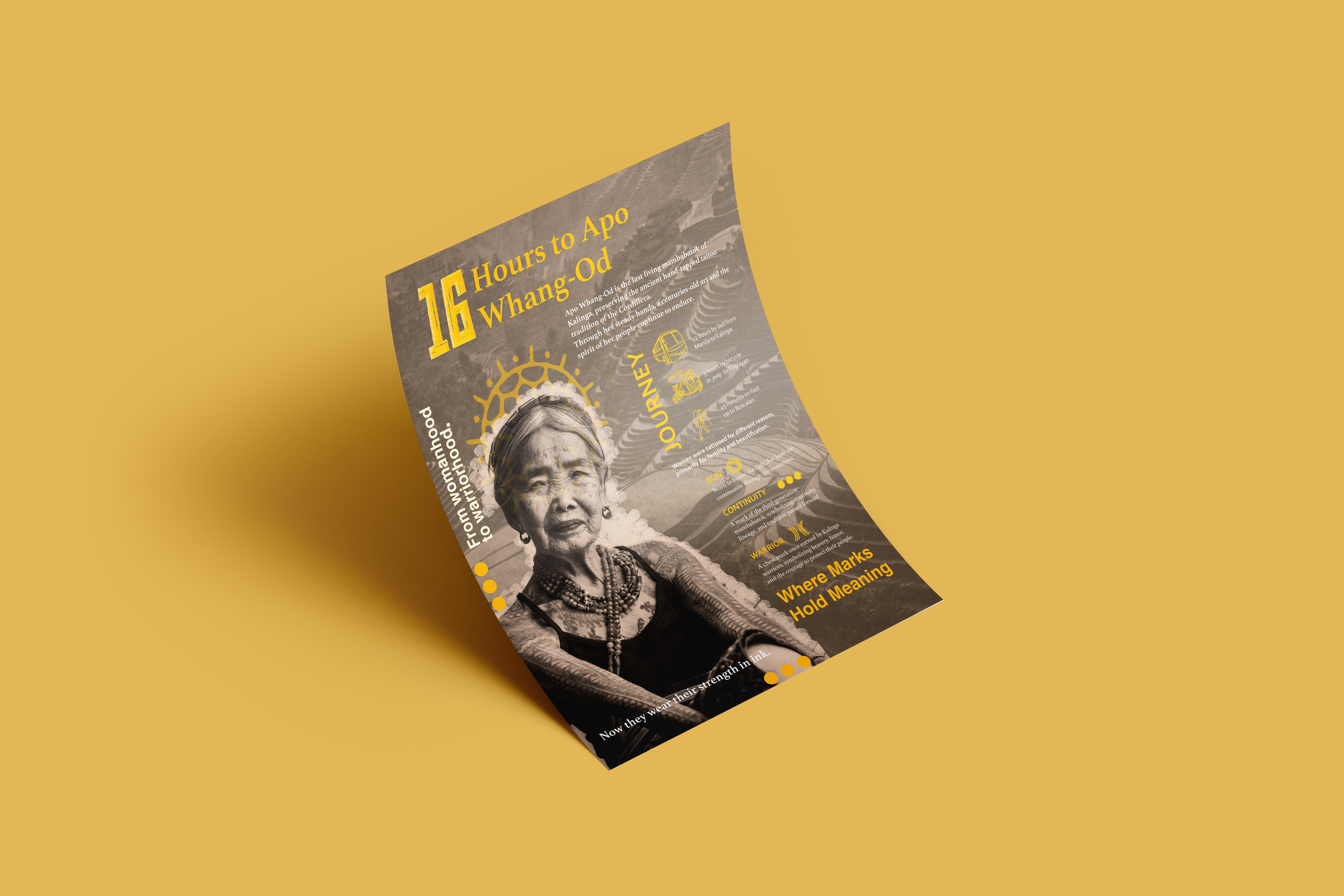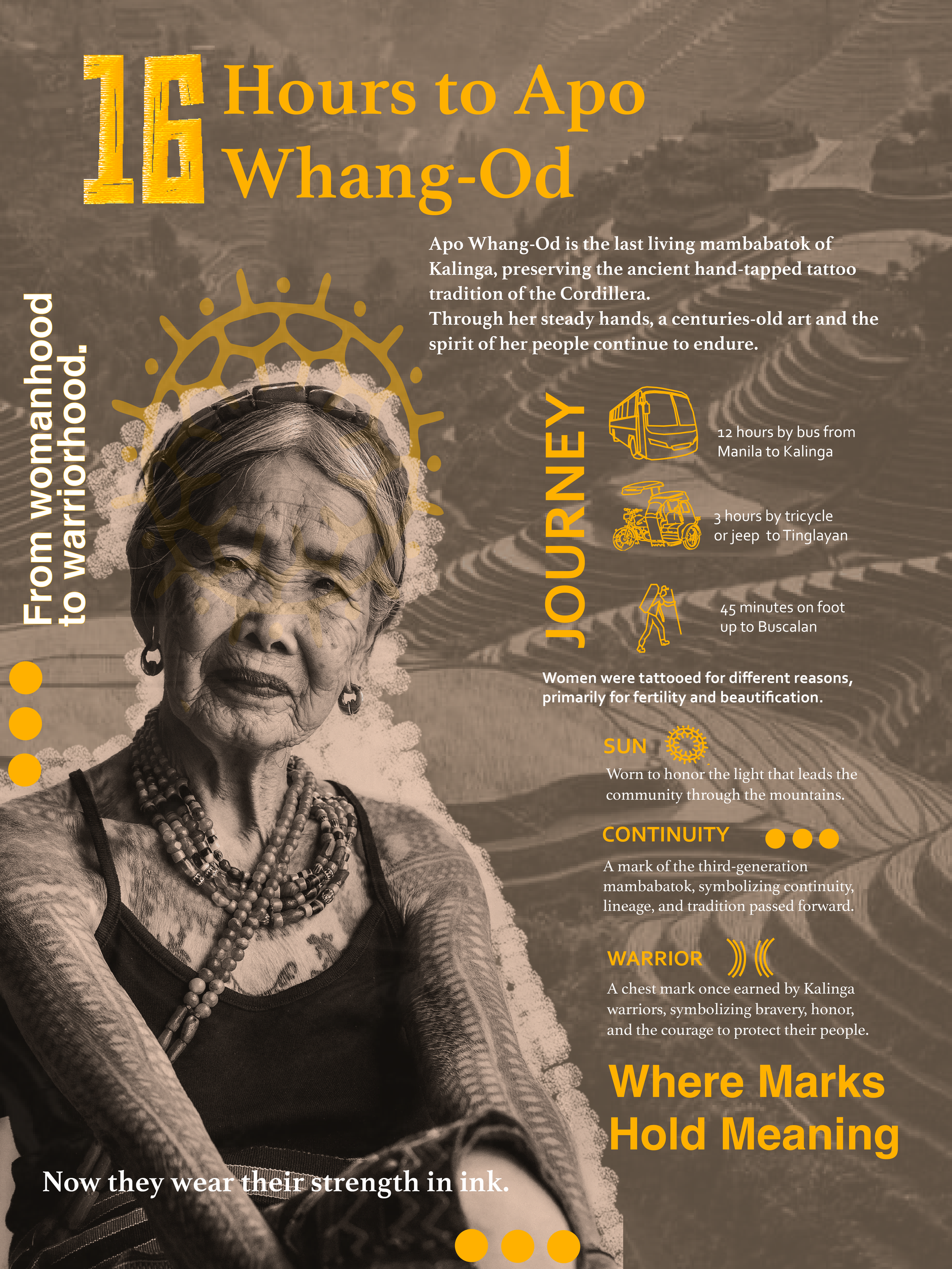 This landmark poster project focuses on Apo Whang-Od, the last and oldest traditional mambabatok (hand-tap tattoo artist) from the Philippines. The poster highlights her cultural significance, the preservation of indigenous tattoo traditions, and the physical journey required to reach her remote village in Buscalan, Kalinga.
